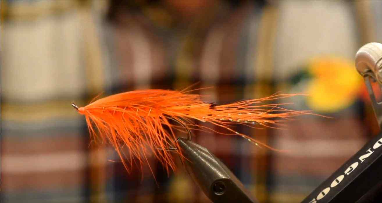 Fluorescent orange bucktail mixed with golden pheasant and rootbeer crystal flash